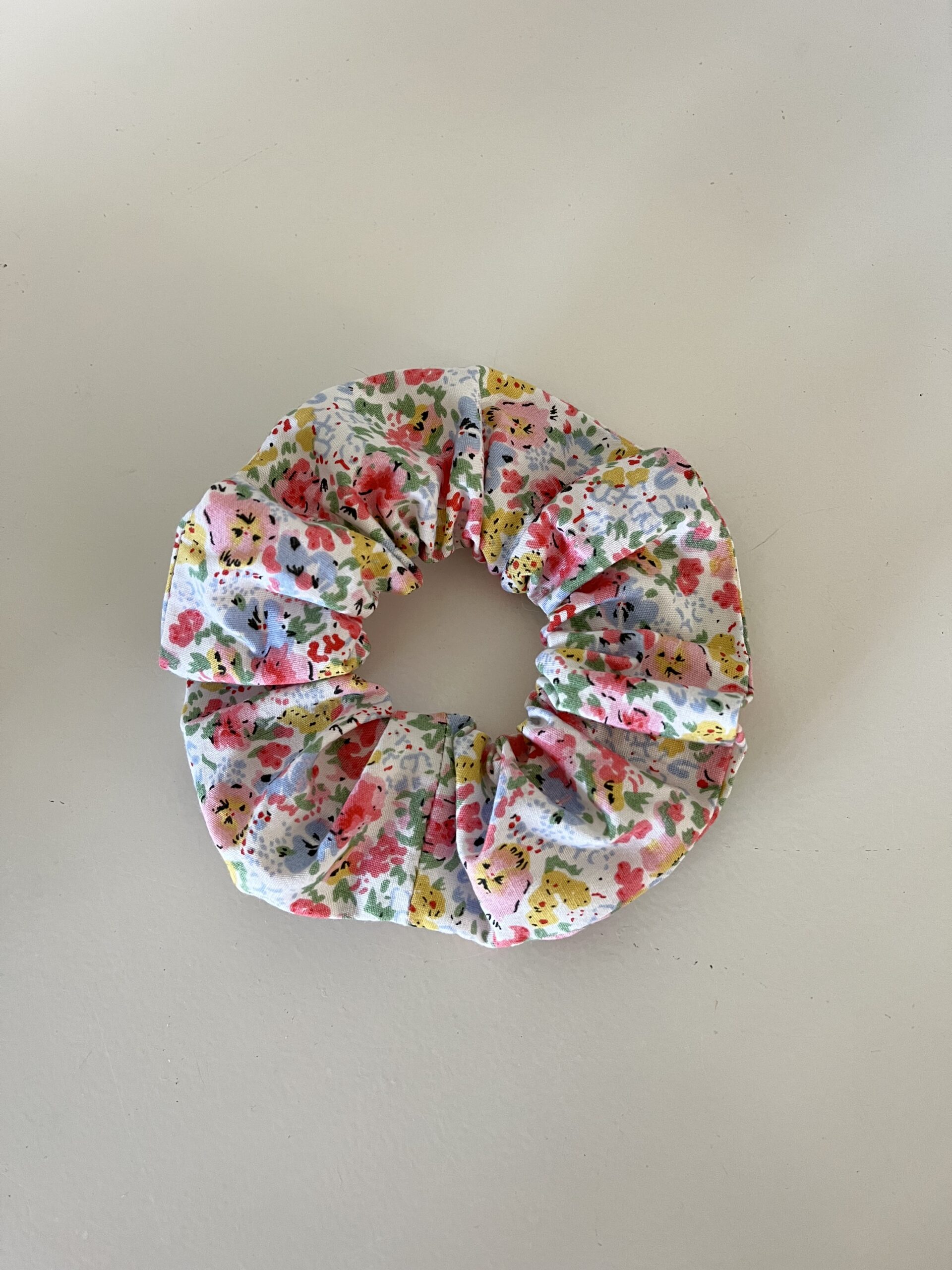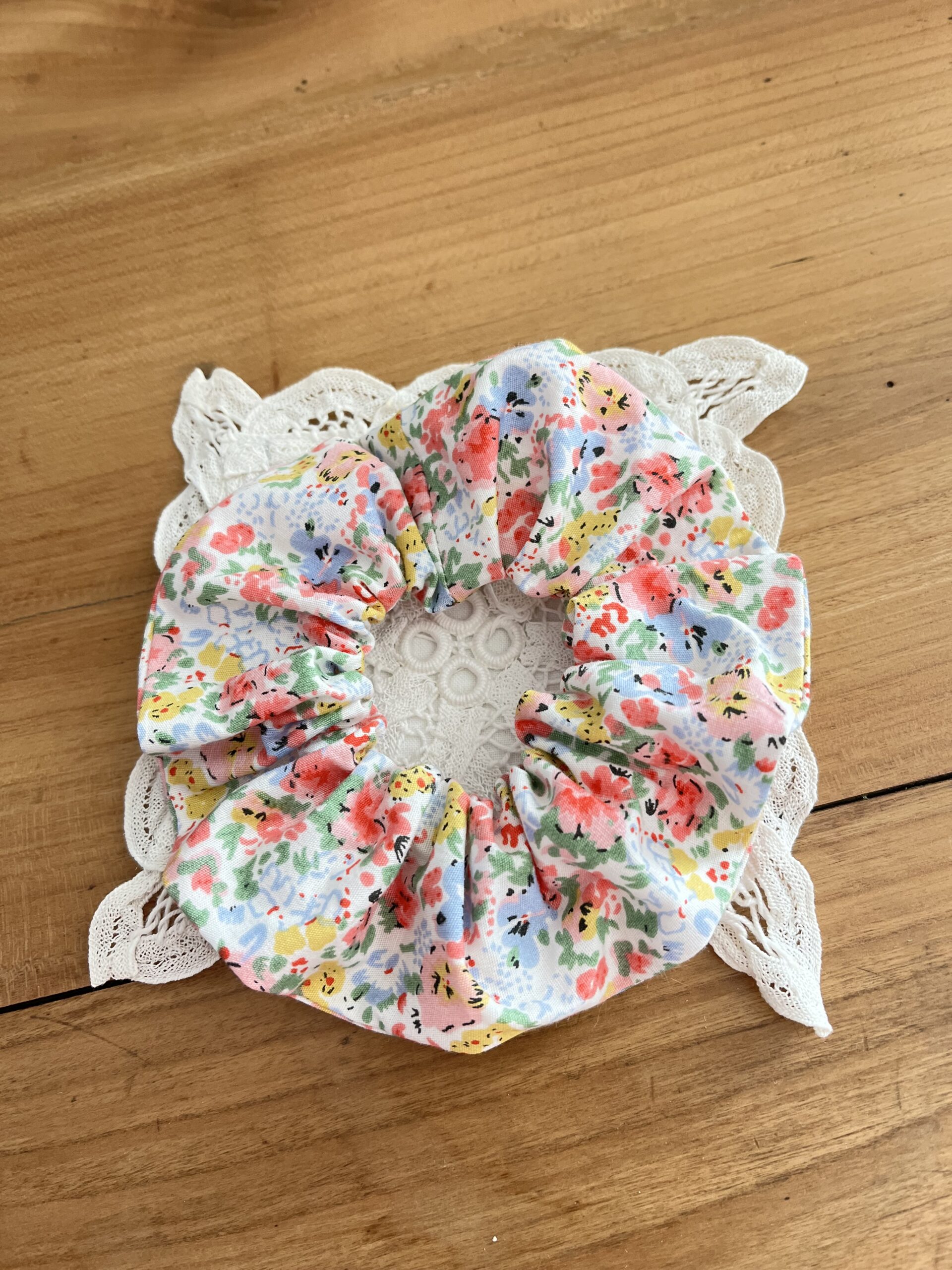 Le chouchou est en tissu coton fleuri.